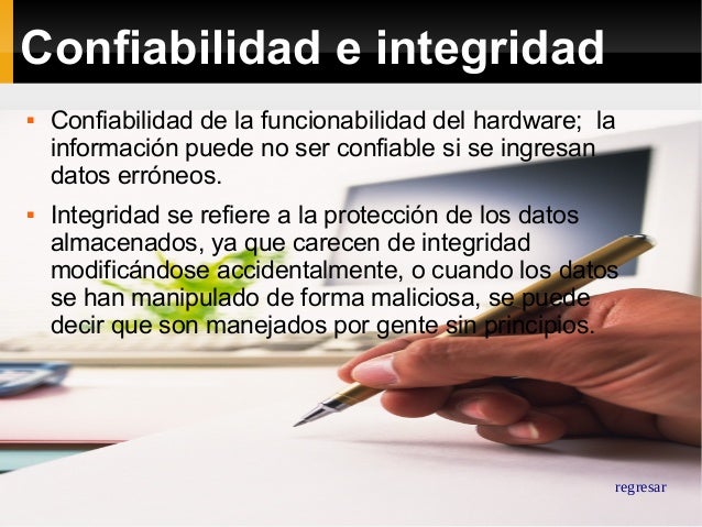 La confiabilidad se refiere al funcionamiento del hardware, el diseño del software, la exactitud de los datos o la correspondencia entre los datos y el mundo real. Los datos pueden no ser confiables si se ingresan incorrectamente o si se quedan anticuados. La confiabilidad de las máquinas, el software y los datos determina nuestra confianza en su valor. La integridad se refiere a proteger la exactitud y la compleción de los datos almacenados. Los datos carecen de integridad cuando se modifican accidentalmente o cuando se manipulan de forma subrepticia o maliciosa. Un ejemplo de datos que pierden su integridad sería cuando la información se duplica en una base de datos relacional y solo se actualiza una copia, o cuando las entradas de datos se han alterado maliciosamente.